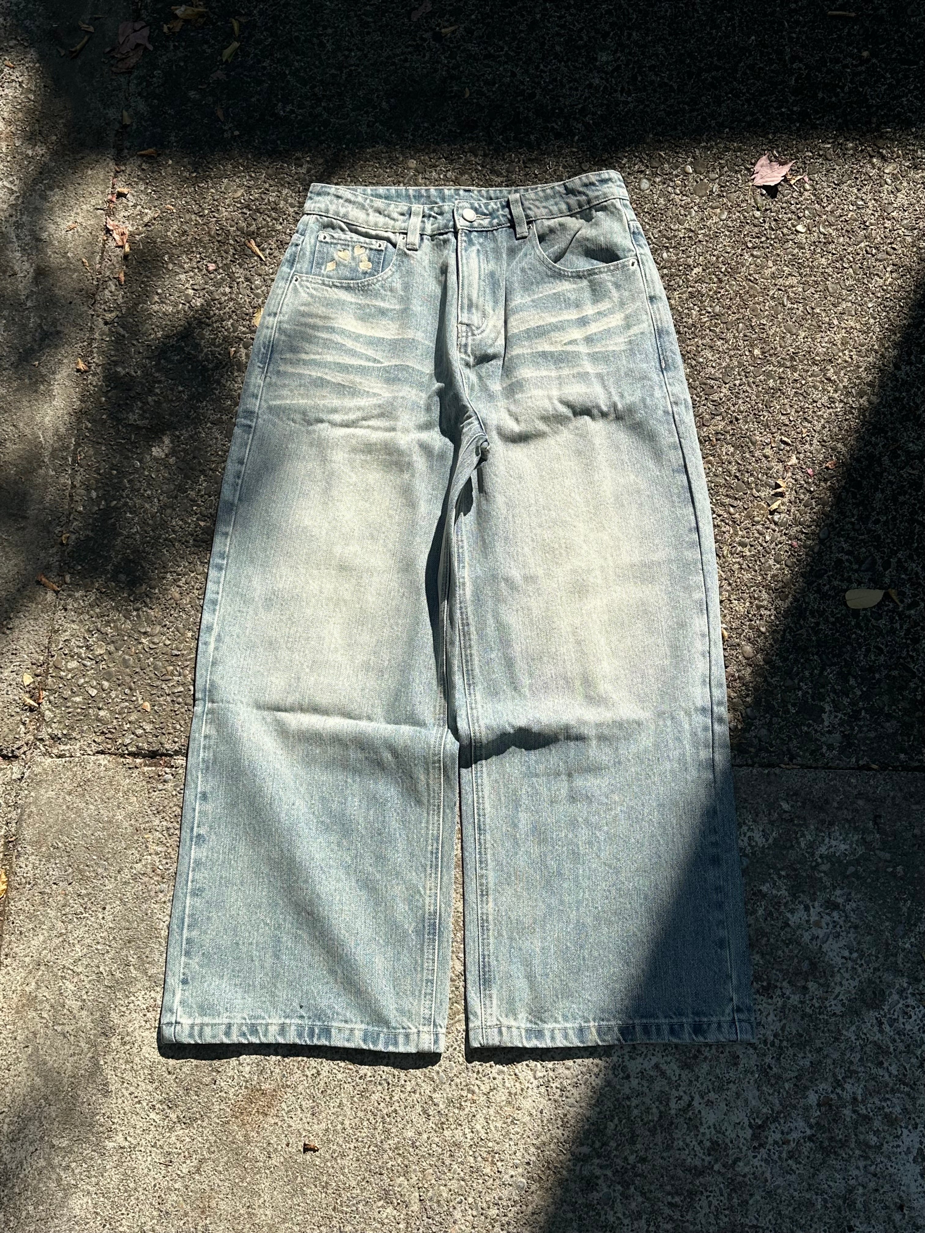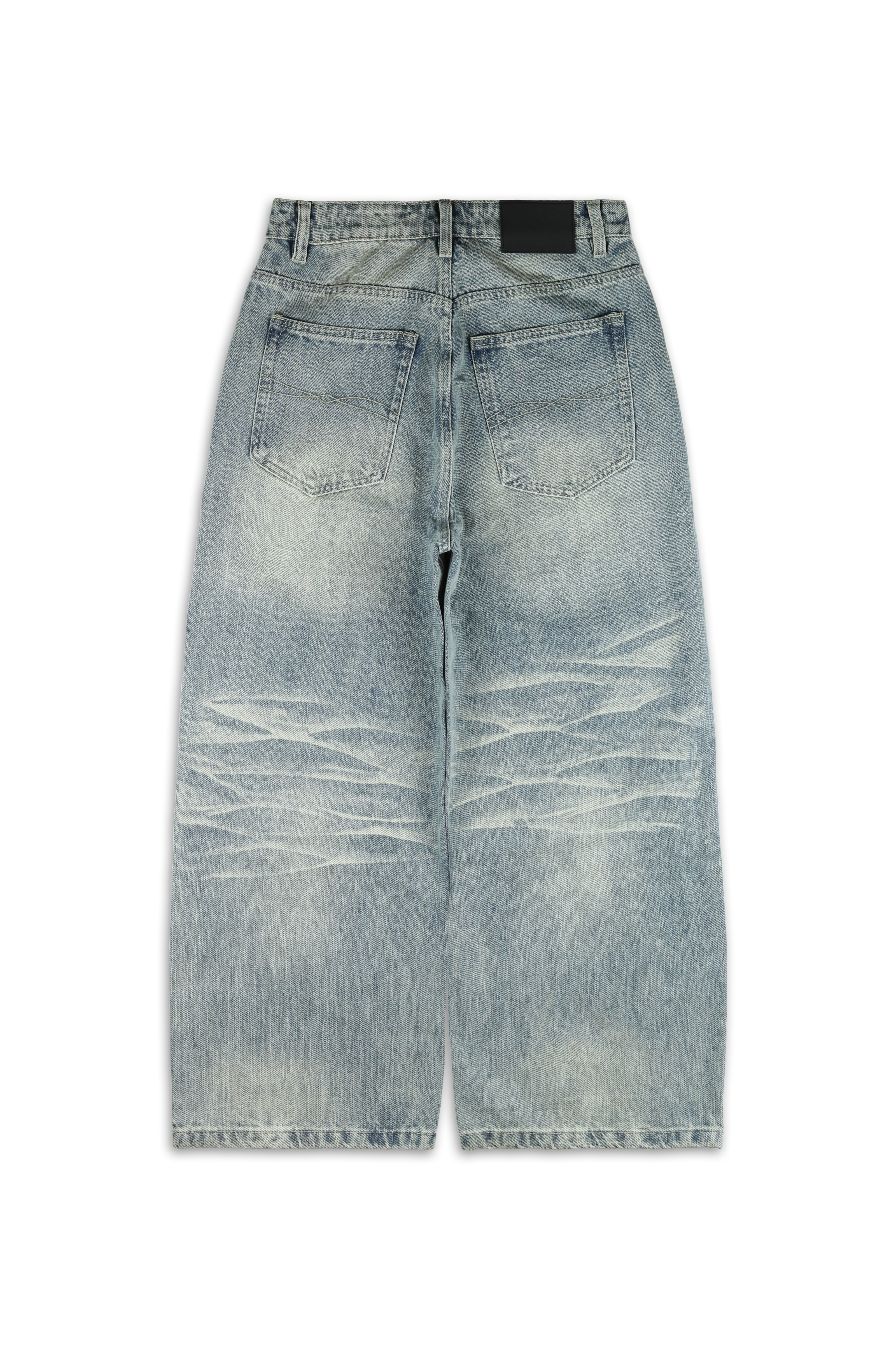 Suits jeans feature a relaxed, baggy fit with a low waist, wide leg, and long length. Made from 100% rigid cotton denim, they offer timeless durability. With a classic five-pocket design, reinforced rivets, and a sturdy copper zipper fly, they’re built to evolve with wear. A matte black leather patch on the waistband adds a bold finishing touch.